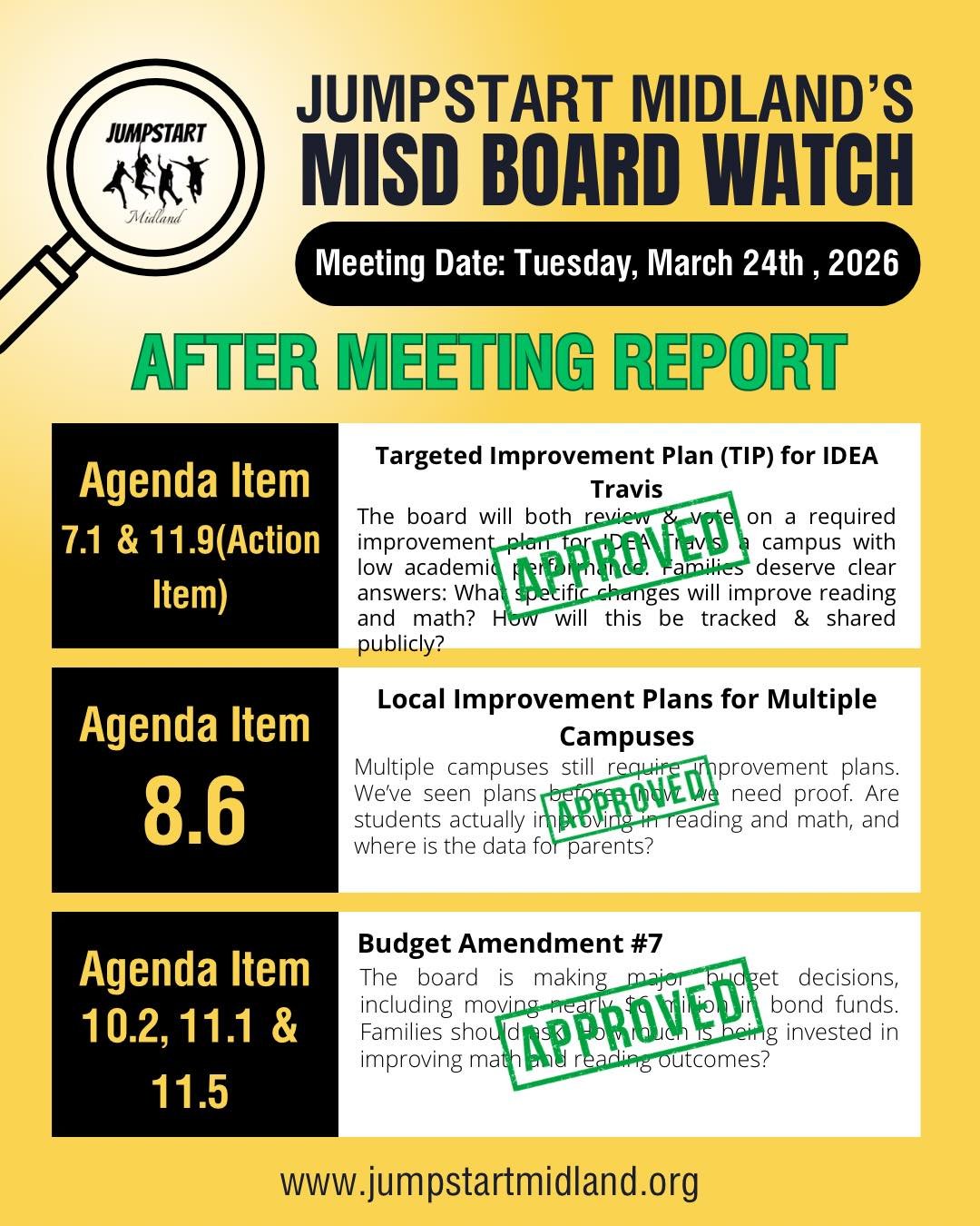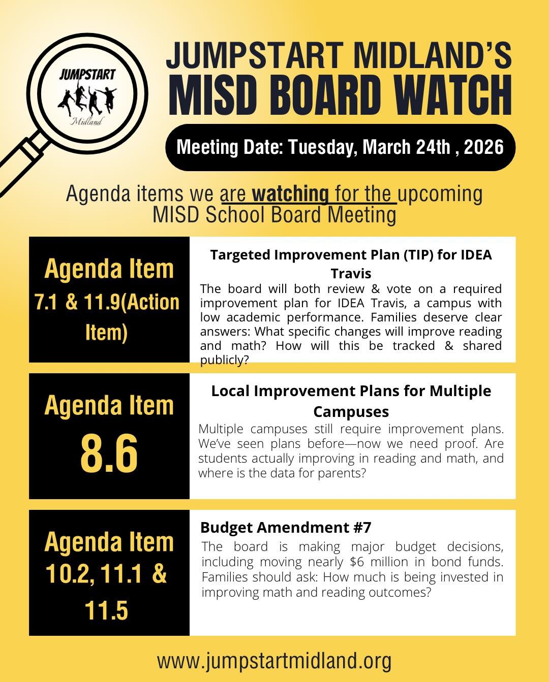 Tonight’s MISD School Board Meeting on February 24th marks the first official night of Board Watch. Here are the agenda items we are watching and our positions on them.